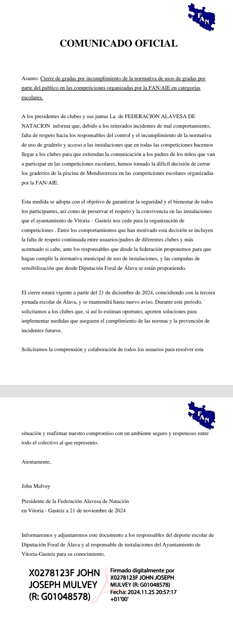 A la finalización del campeonato, el Colegio de Árbitros de la Federación Alavesa de Natación procedió a la entrega de cuarenta y tres premiaciones repartidas entre las diferentes categorías del campeonato federado - infantil, junior, absoluto joven y senior - además de un premio honorífico para Estitxu Nanclares Medrano, la Medalla de Servicios Distinguidos – Medalla de Oro de la Federación Alavesa de Natación, por sus más de 25 años arbitrando. Estitxu recibe también la ovación, el cariño y el agradecimiento de toda la natación alavesa.